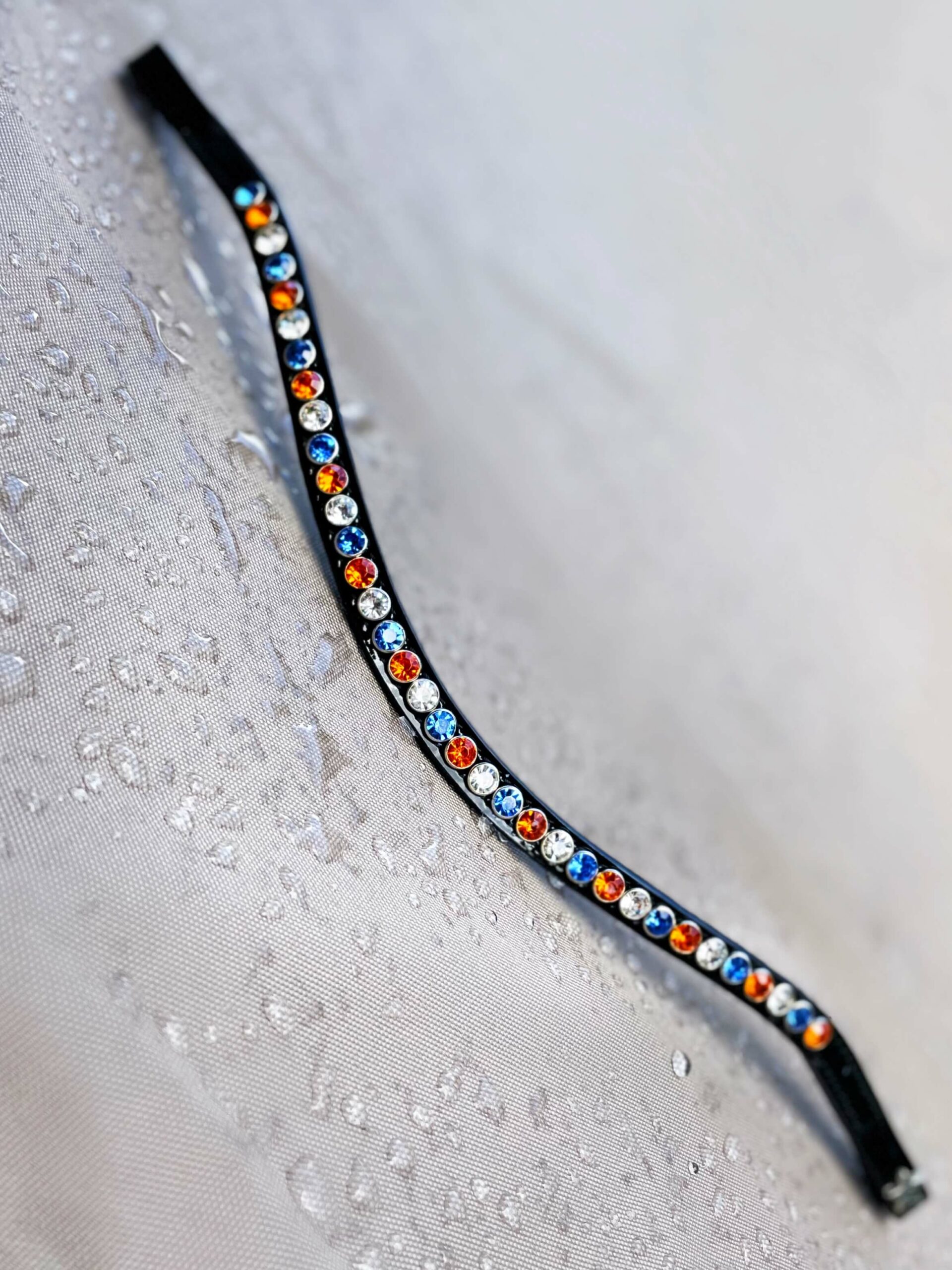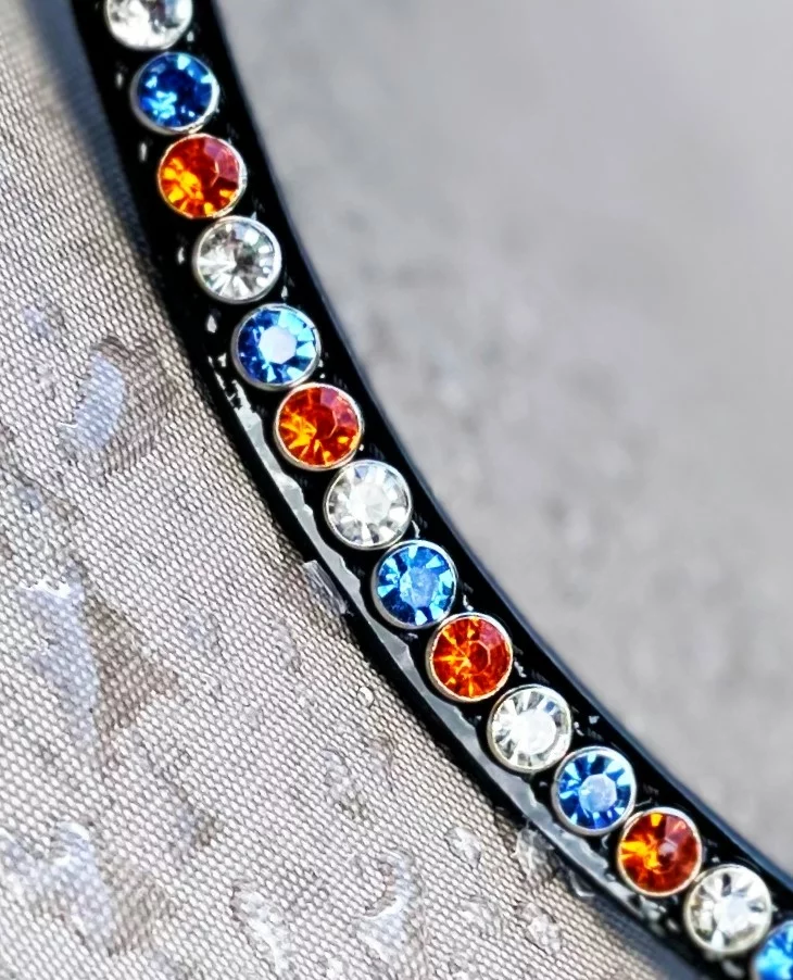 De Frontriem Hermès II heeft een enkele rij steentjes en bestaat uit de kleurencombinatie Orange, Crystal en Sky. Dinja van Liere schitterde al eerder met de frontriem op het WK.
