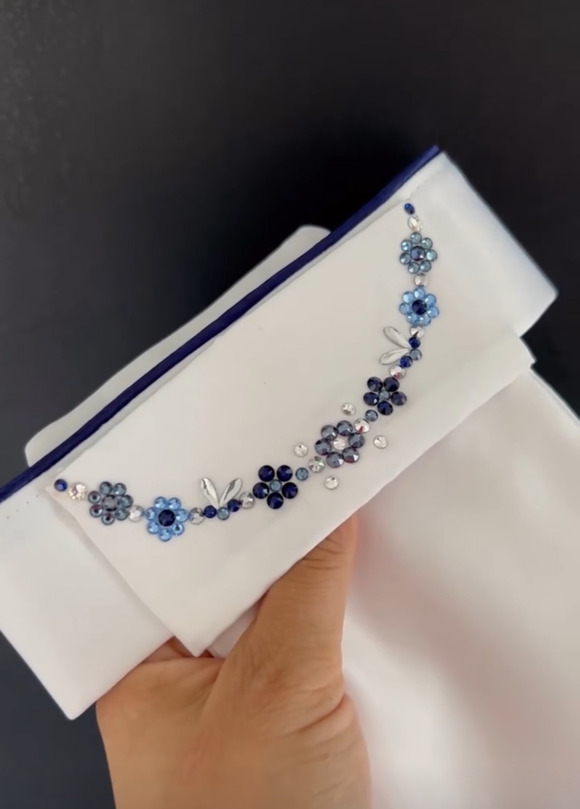 Samen kijken we welke kleur steentjes het beste past bij jouw wensen en design. Je kan bij kleur de kleuren toevoegen. Ik neem altijd nog contact met je op voordat ik de plastron maak. Zo weten we zeker dat ik de juiste kleur gebruik.