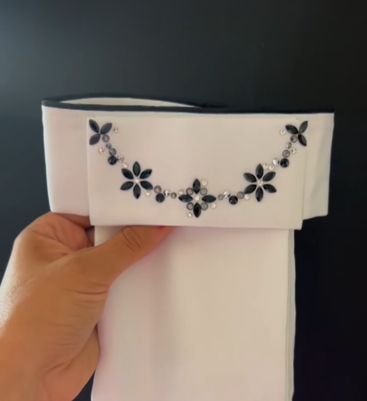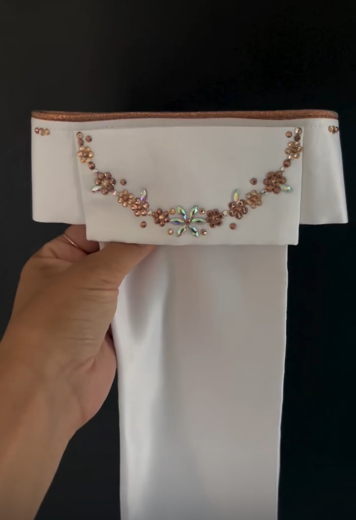 Op de website en onze social media zie je voorbeelden van plastrons. Je hebt de keuze tussen een plastron met op de voorkant steentjes, of een plastron met op de voorkant en langs de rand steentjes.